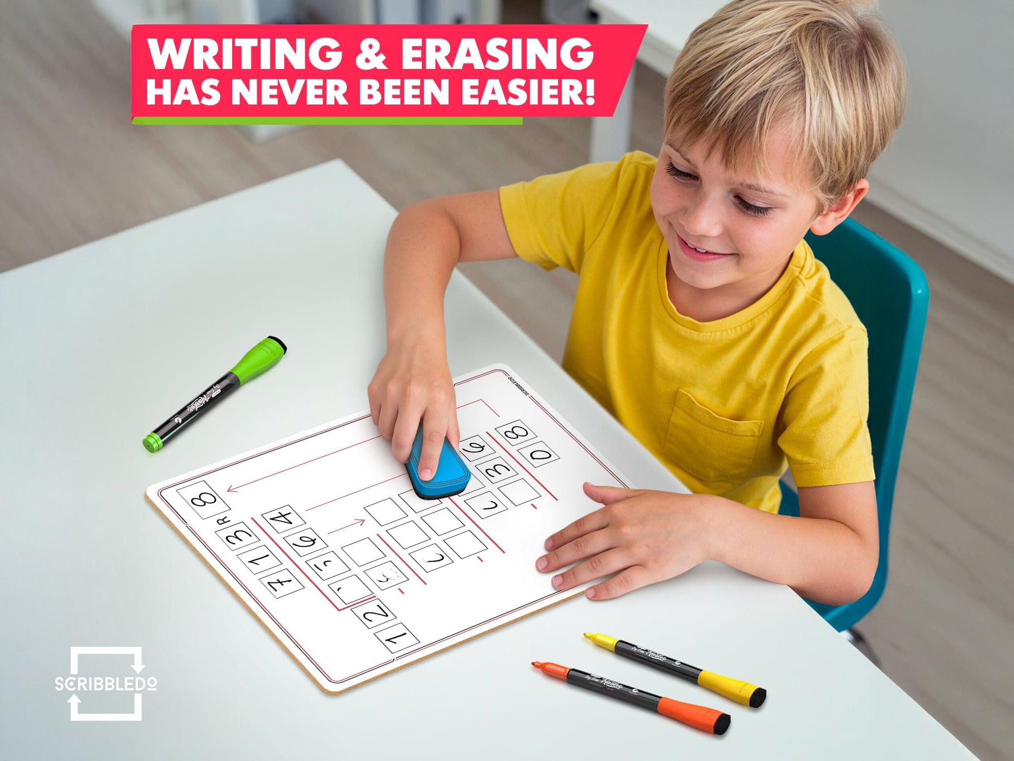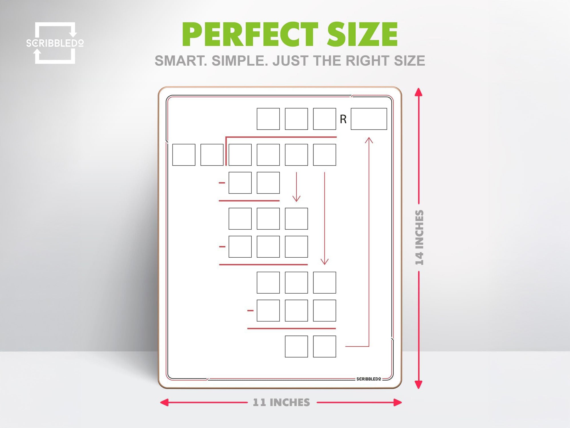 The Scribbledo 11x14 Division Dry Erase Board is designed for practicing long division with 2-digit divisors. This reusable student whiteboard gives learners the structure they need to stay organized through every step — divide, multiply, subtract, and bring down.
