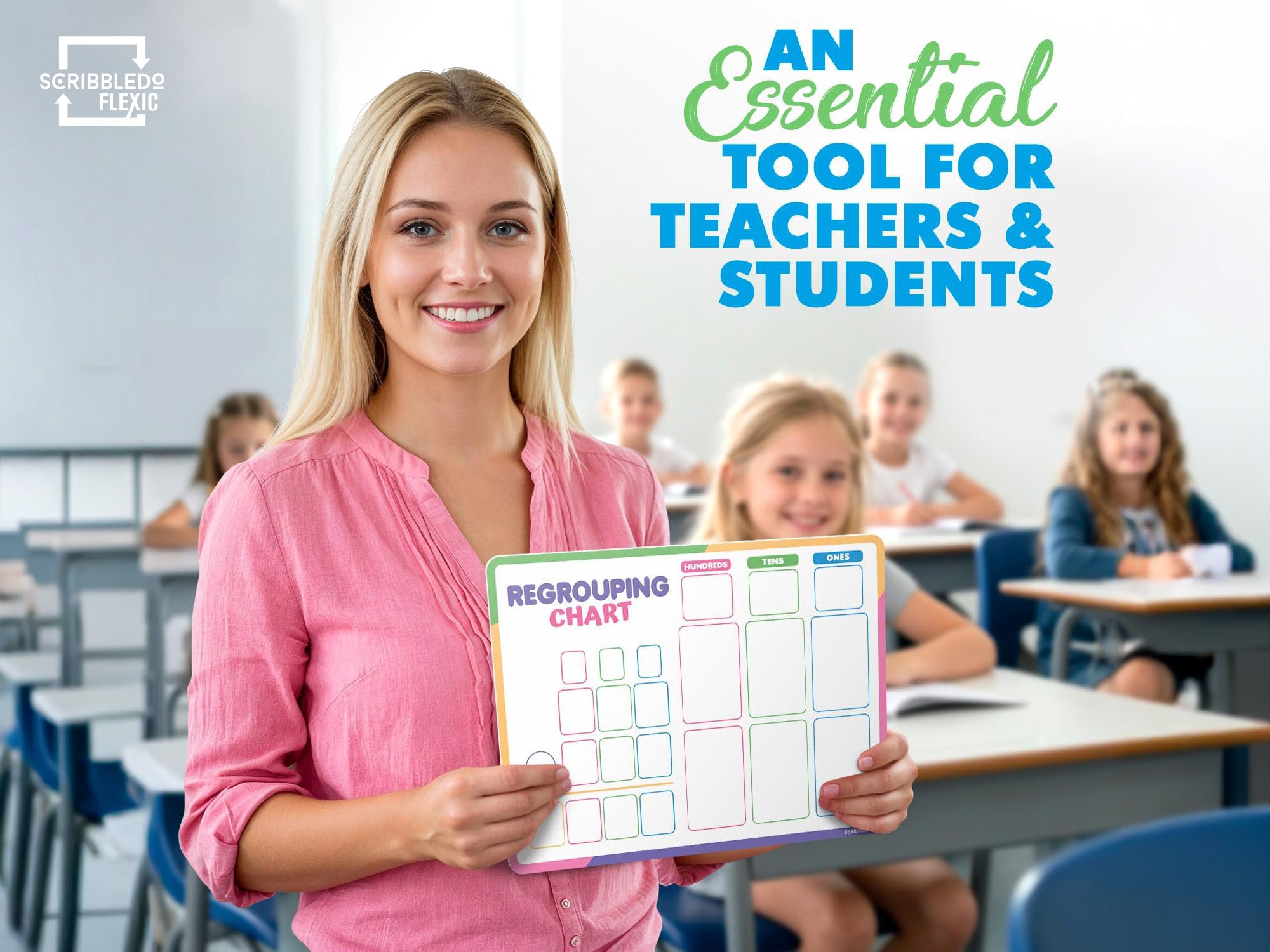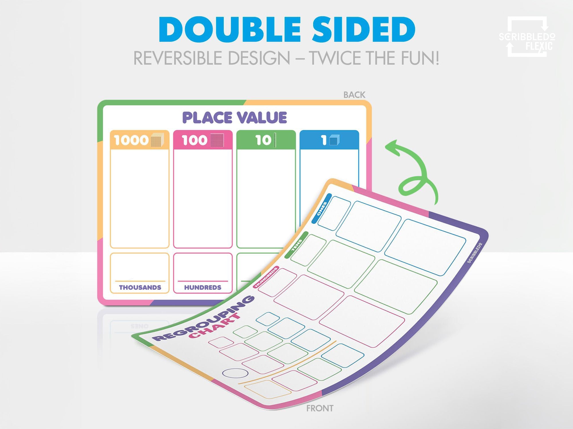 Make math practice easier, clearer, and more engaging with our Scribbledo Regrouping & Place Value Flexic Sheets. Each sheet features a durable dry erase surface and a flexible, lightweight design that lays flat yet is easy to store. One side includes a clean, structured place value for ones, tens, hundreds, and thousands; the reverse side offers a regrouping chart layout that helps students visualize carrying and borrowing during addition and subtraction.