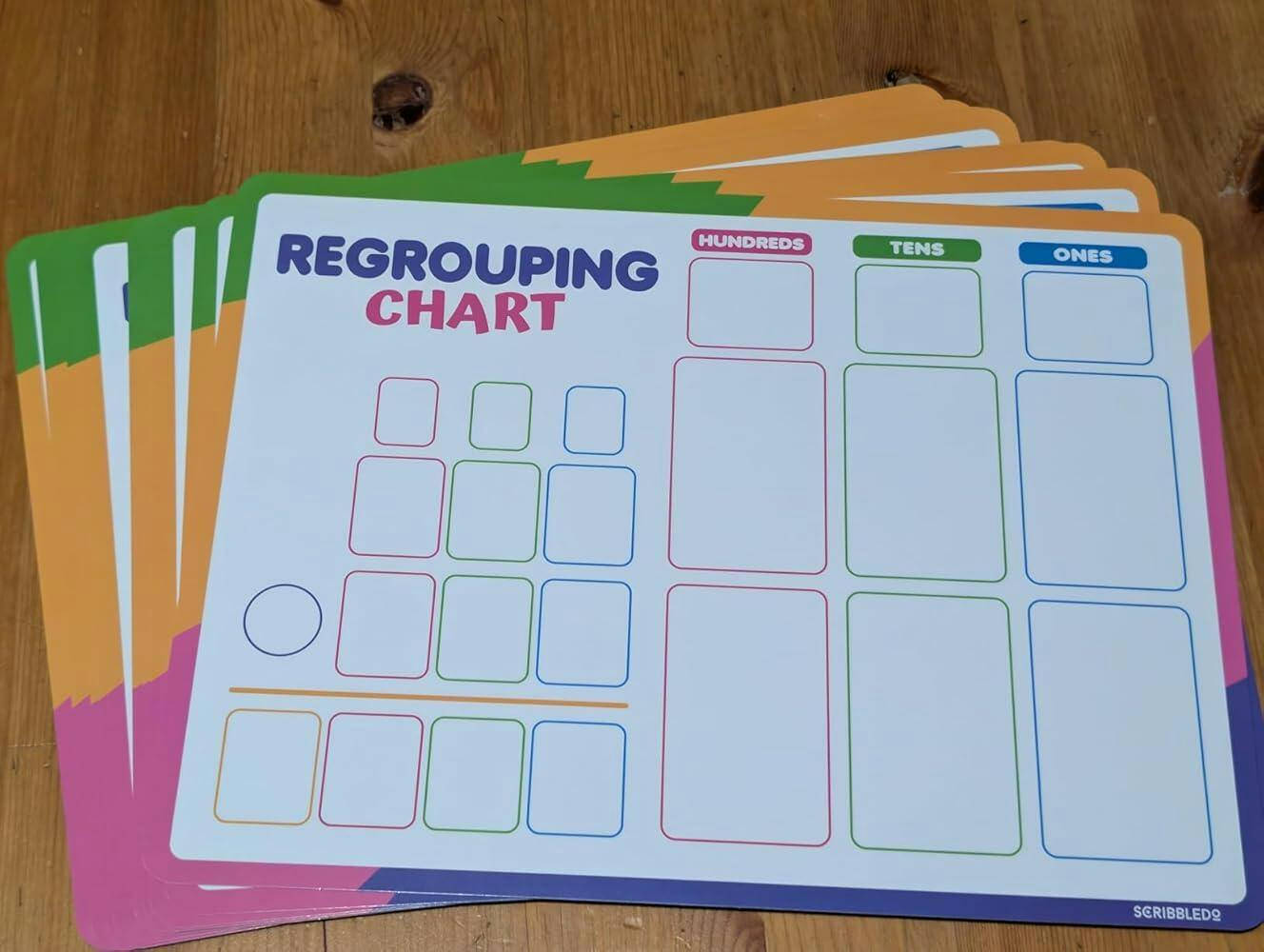 Double Sided Learning – Regrouping chart on one side and place value chart on the other for base ten addition and subtraction practice.